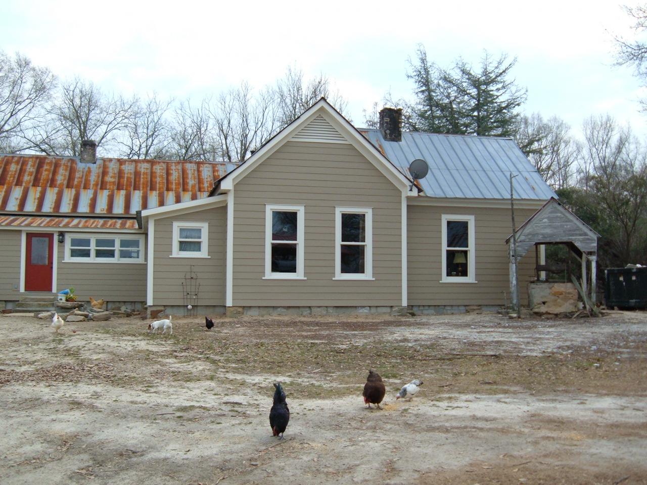 The vinyl siding was removed and the old wood siding was too damaged to restore. Hardiboard type siding has been installed. The entire house was insulated, decked and wrapped with Tyvec before the siding went on. The roof remains in it's original condition and does not leak.